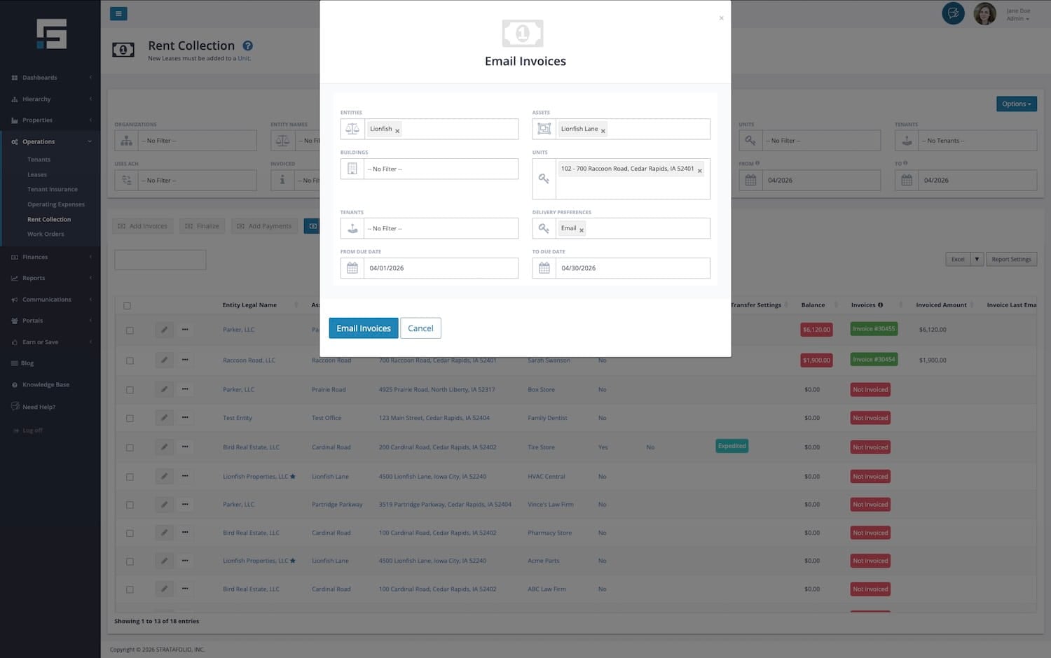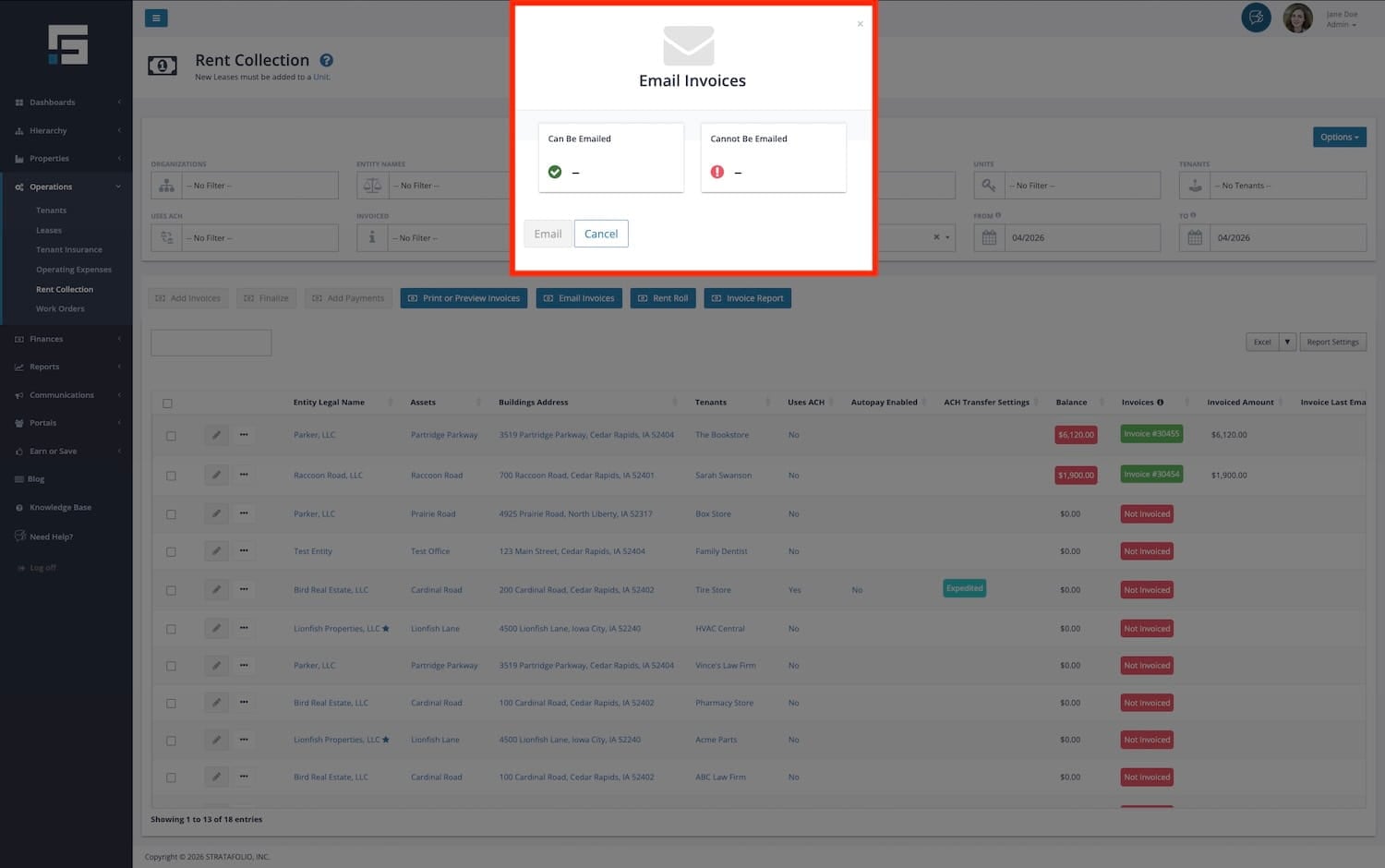 STRATAFOLIO allows you to email finalized invoices to tenants. You can email invoices individually or in bulk from the Rent Collection Index. Each method behaves differently, so it is important to understand which options are editable and which are controlled by tenant-level settings.