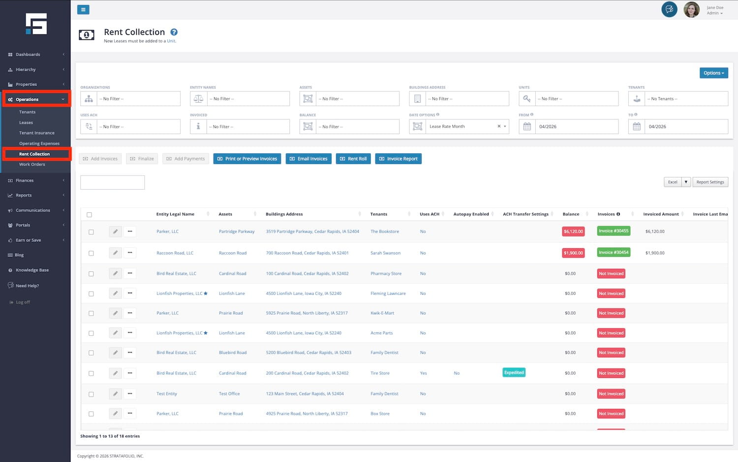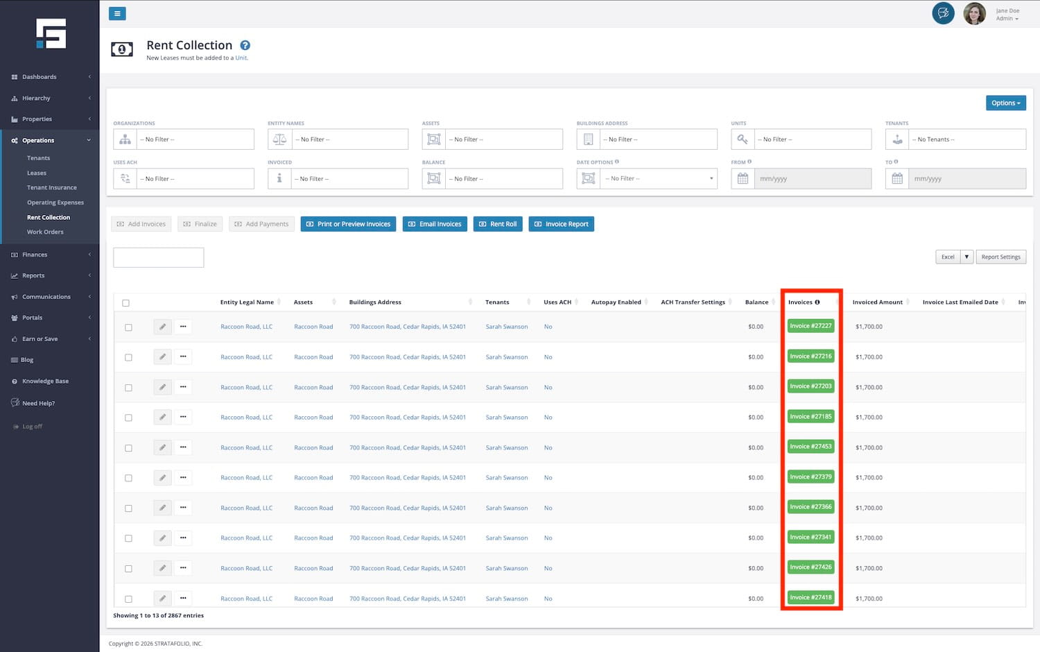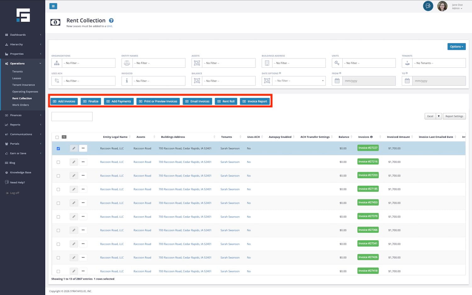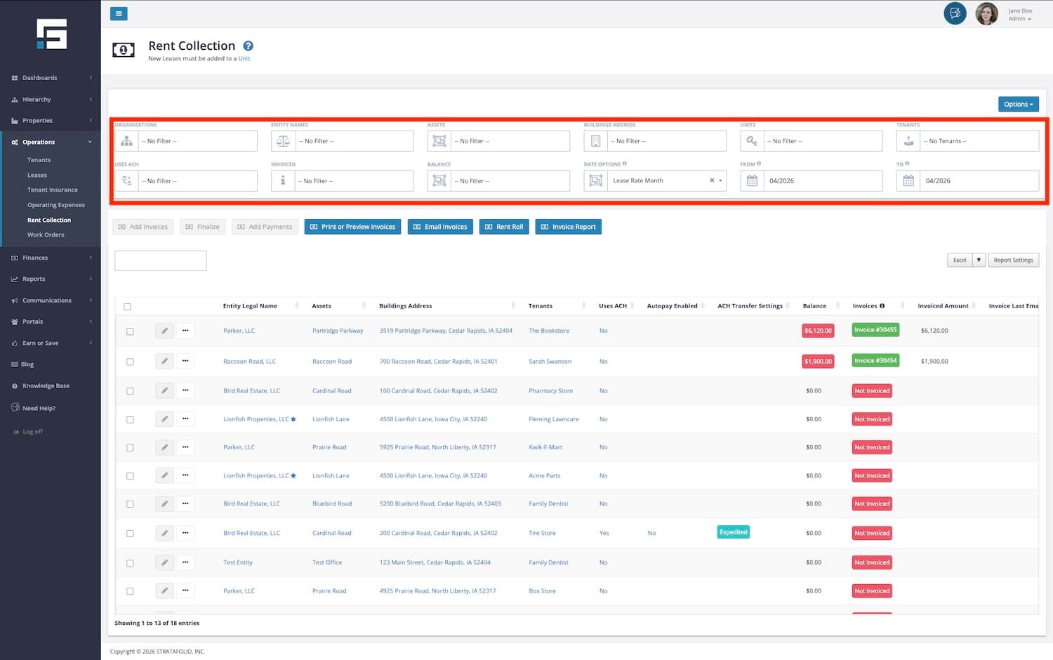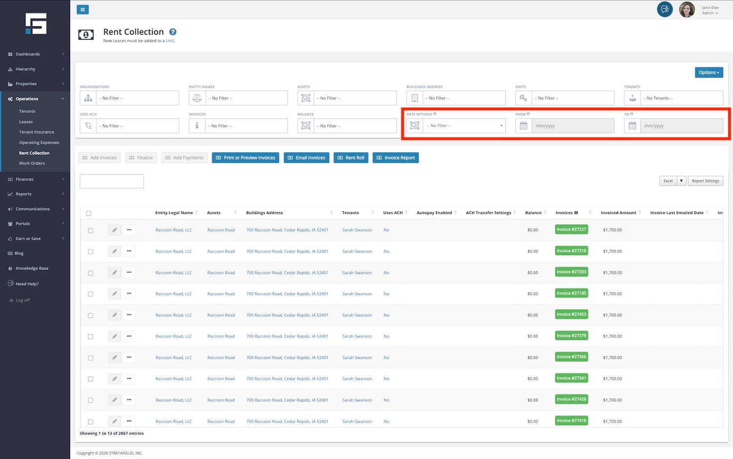 The Rent Collection page contains a lot of information regarding Invoices, Payments, and Rent Roll. It includes the ability to sort, filter, and search for invoices across all of your STRATAFOLIO tenants and leases in one easy-to-use location.