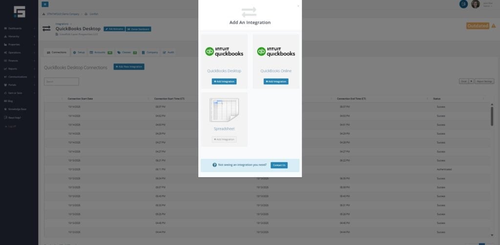 One of the platform’s most valuable capabilities is integrating QuickBooks, both QuickBooks Online and QuickBooks Desktop, directly into your portfolio management workflow. This integration bridges the gap between operational and accounting data, giving you instant, accurate financial insights without the manual work.
