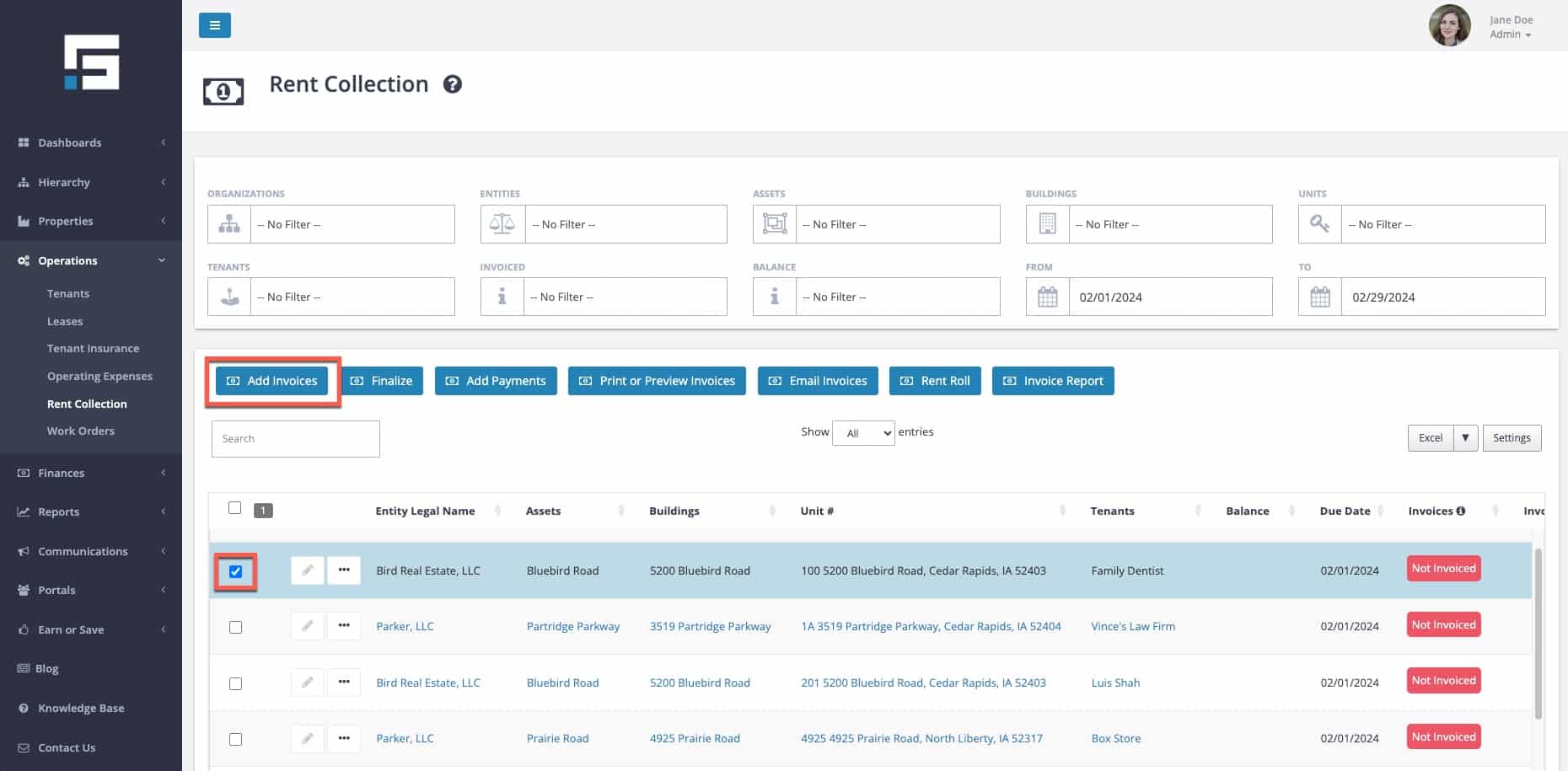 - Choose the tenant for whom you need to make an invoice. Select Add Invoices.