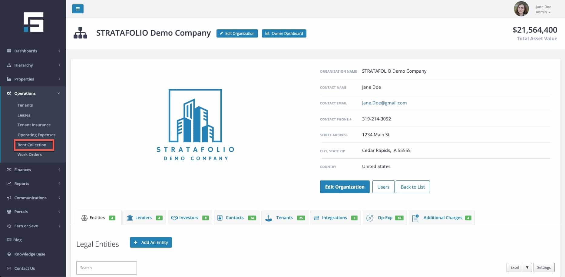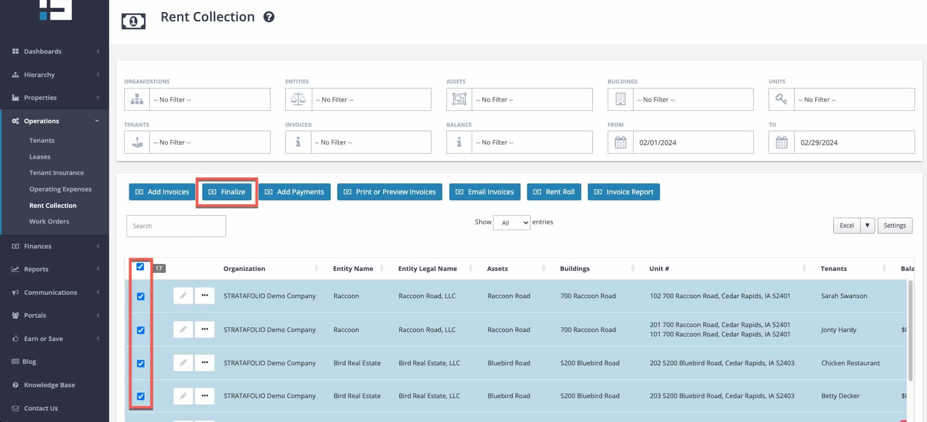 - Using the left-hand navigation in STRATAFOLIO, select Operations and then Rent Collection.