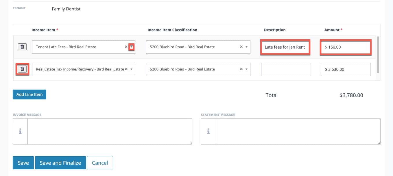 - Change the top Income Item to Prior Year Recoveries, Tenant Late Fees, or whatever the Income Item is that you created. Add a description to the item and change the amount to the amount due for the tenant. Delete all other Income Items as needed with the Trash Can. The only line item on the invoice is the true-up.