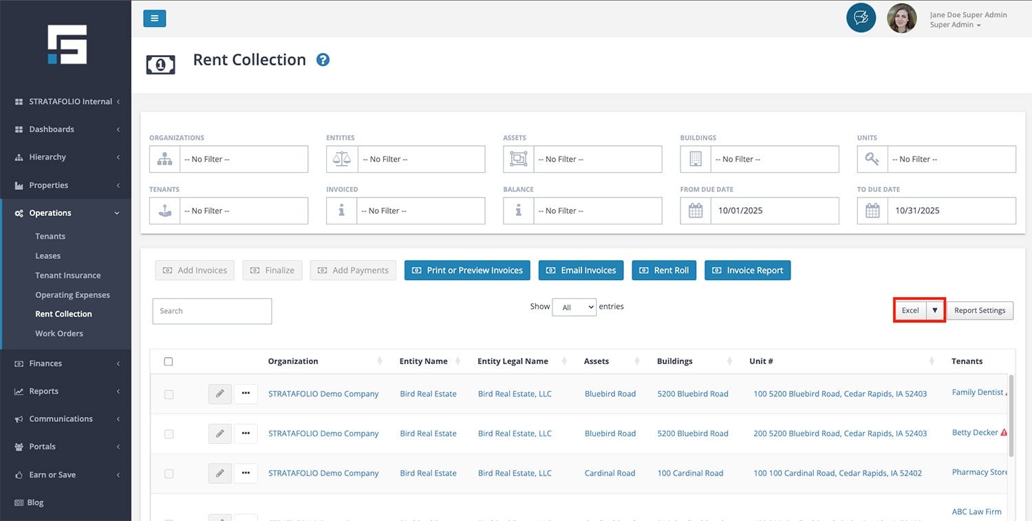 STRATAFOLIO makes reporting flexible by allowing you to export data from any table across the platform. Whether you want to analyze tenant payments, lease data, or financial performance, you can quickly download reports into Excel, CSV, or PDF.