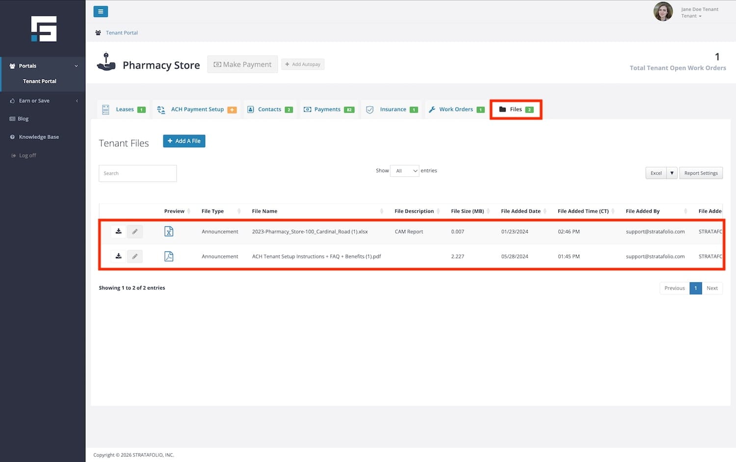 - Organization: STRATAFOLIO automatically stores attachments in the Tenant Portal, eliminating the risk of lost emails.