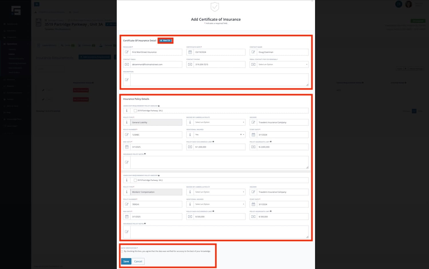 Once our machine-learning model finishes doing the hard work for you, you will see a new form containing the prepopulated COI information, and we’ll do our best to match all the insurance policies in the COI to your lease requirements.