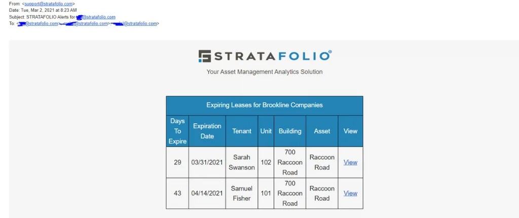 STRATAFOLIO generates email alerts for an expiring insurance policy until you update the policy or the lease expires.