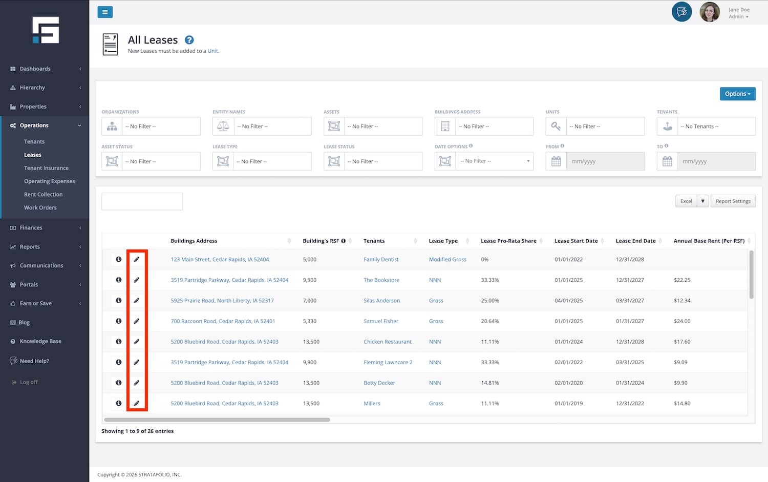 Identify the lease that you need to update. Use the pencil icon to edit the lease.