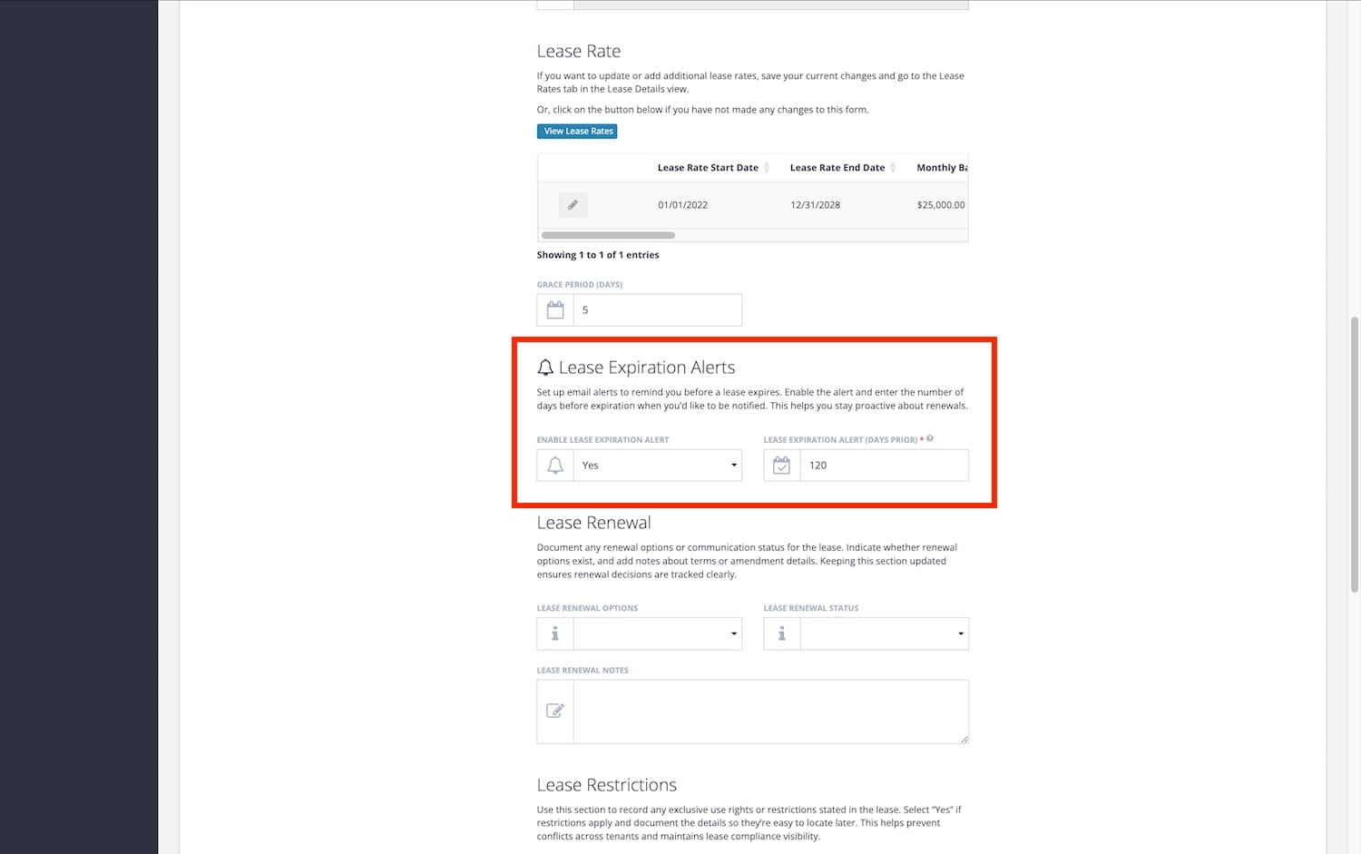 - Lease Rate Start and End Dates – The start and end dates will automatically populate to the next 1 year from the prior lease rate entered. You can update these fields as needed.
