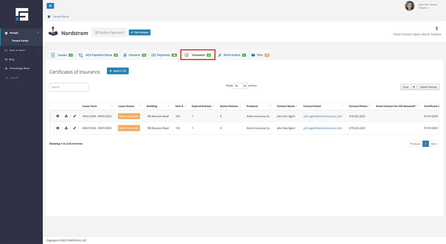As a tenant, your landlord requires you to maintain valid insurance coverage during your lease term. STRATAFOLIO makes it easy for you to upload and manage your Certificate of Insurance (COI) directly from your Tenant Portal, so your landlord always has the latest version on file.