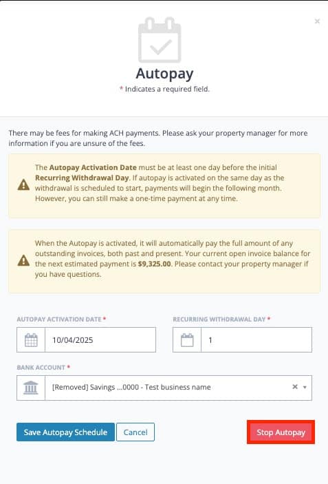 Once stopped, STRATAFOLIO will not attempt to run ACH autopay for future invoices. Tenants may still make one-time ACH payments if needed, but recurring payments will no longer process automatically.