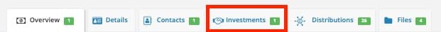 There are multiple ways to get to the Investor Dashboard dependent on the investor’s role. For a Full Access Investor, the most efficient way is to go to the lefthand side, click on Finances, go to Investors, and then the i icon of the investor, and finally click the Investments tab.