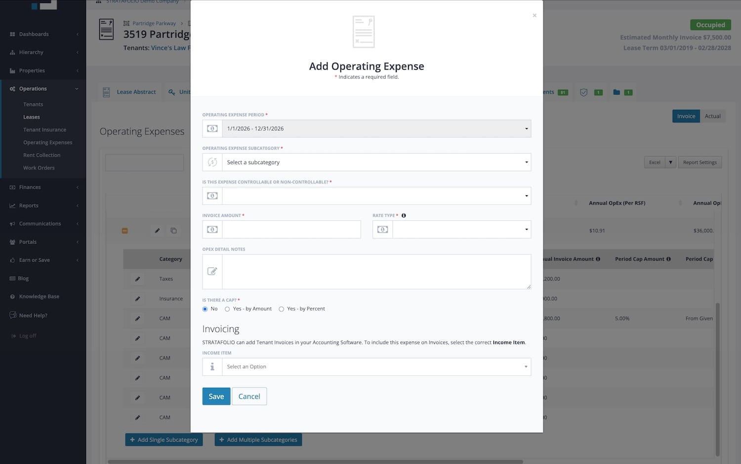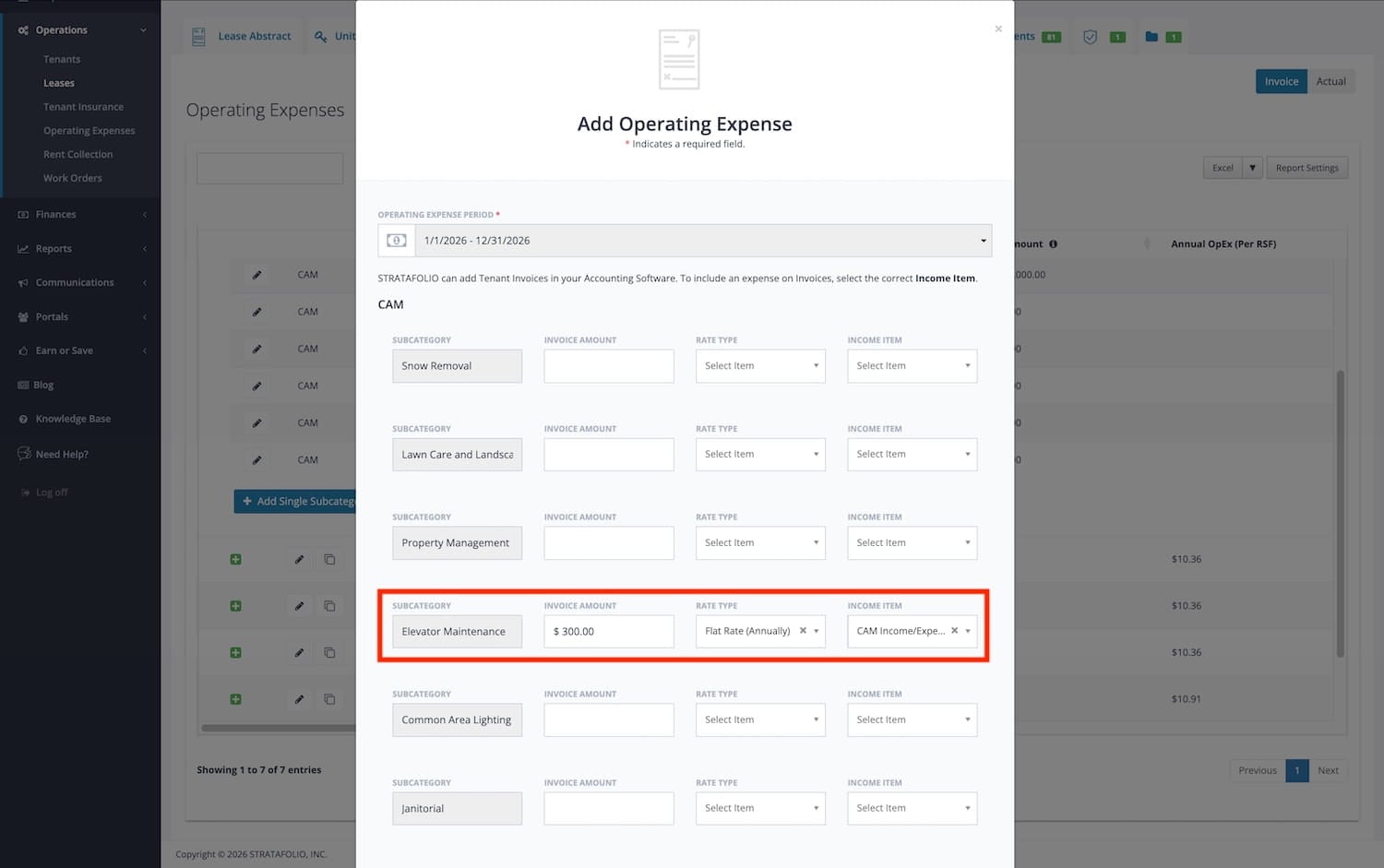NOTE: To appear on the Actuals tab and create a CAM Reconcilaition Report, the subcategories must be inputted on the Invoicing portion. Any income items with a $0 amount will disappear from the invoice during creation. However, you need to include these items to ensure they appear on the CAM Reconciliation Report in STRATAFOLIO. This allows you to pull all of the expenses spent for a building without adding additional income items on the invoices for the tenants.