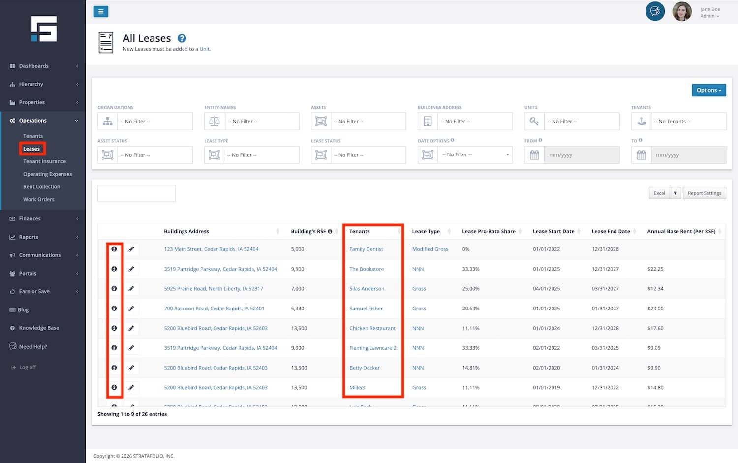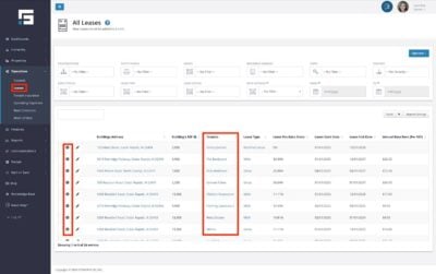 - Find the Tenant in Leases View that you are looking for and select the i to the left of the row to get more information about the lease