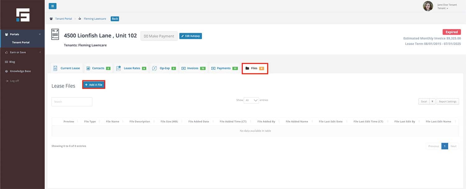 The Tenant Portal in STRATAFOLIO offers tenants a place to view lease information, set up ACH payments, and view or upload files. This article will focus on the tenant’s access to view, edit, delete or upload files.