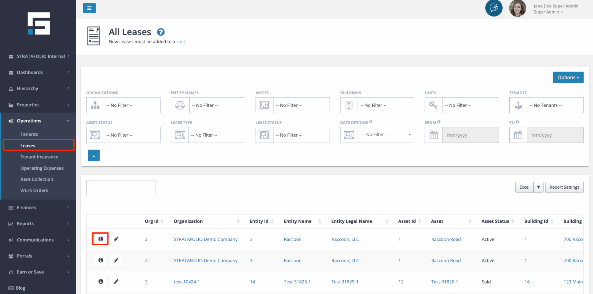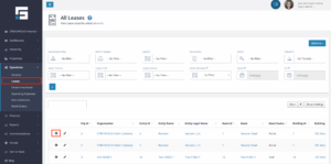 In the left sidebar, go to Operations. Click Leases. Find the lease you want to update (use the search or dropdown filters if needed). Click the i (info) icon for that lease to open the Lease page.