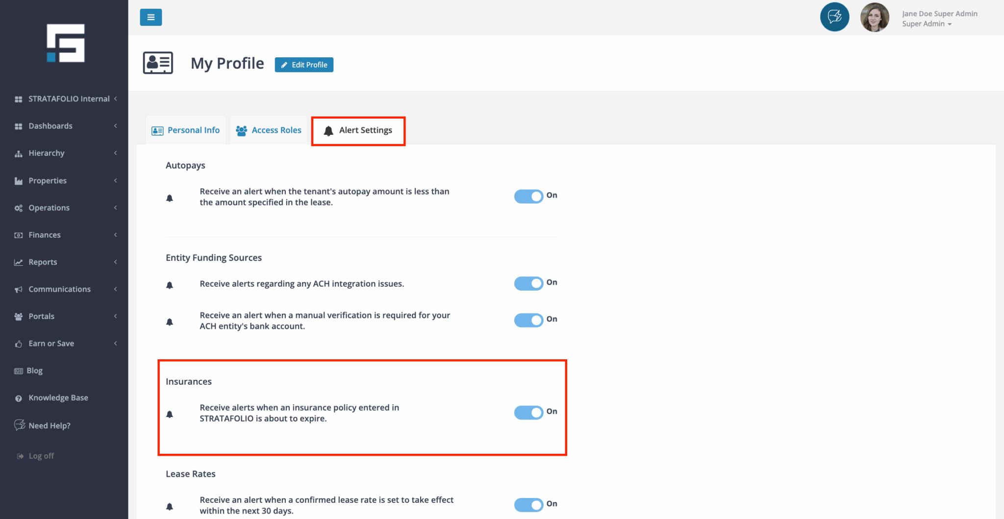You can customize your alerts so you receive multiple notifications ahead of a policy expiring. To do this, go to your Profile in STRATAFOLIO.