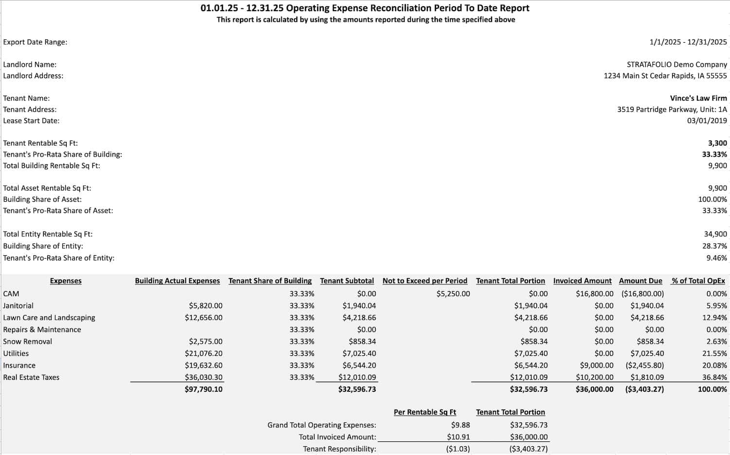 As mentioned above, STRATAFOLIO can also apply 100% of a reimbursable expense to a tenant’s CAM Reconciliation report.