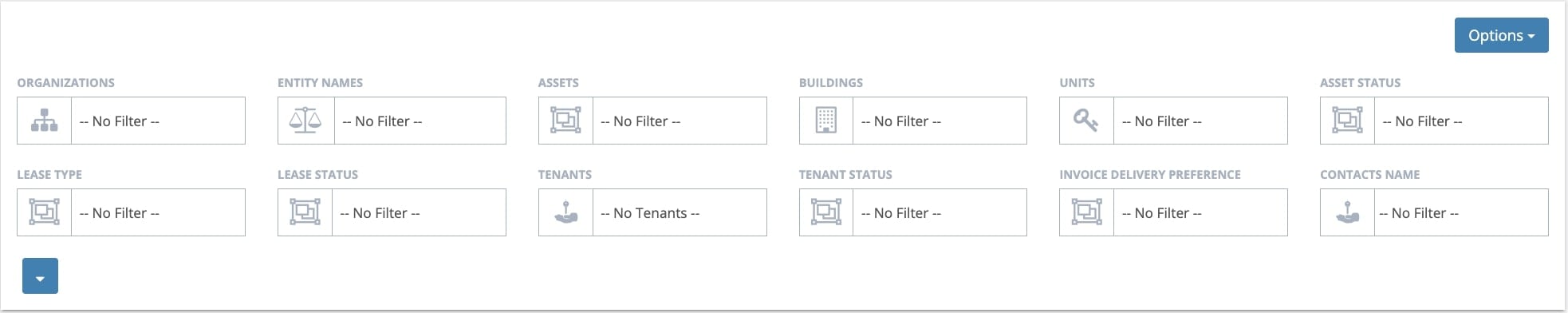 Each dropdown represents a key data category, such as Entity, Asset, Building, Unit, or Status.