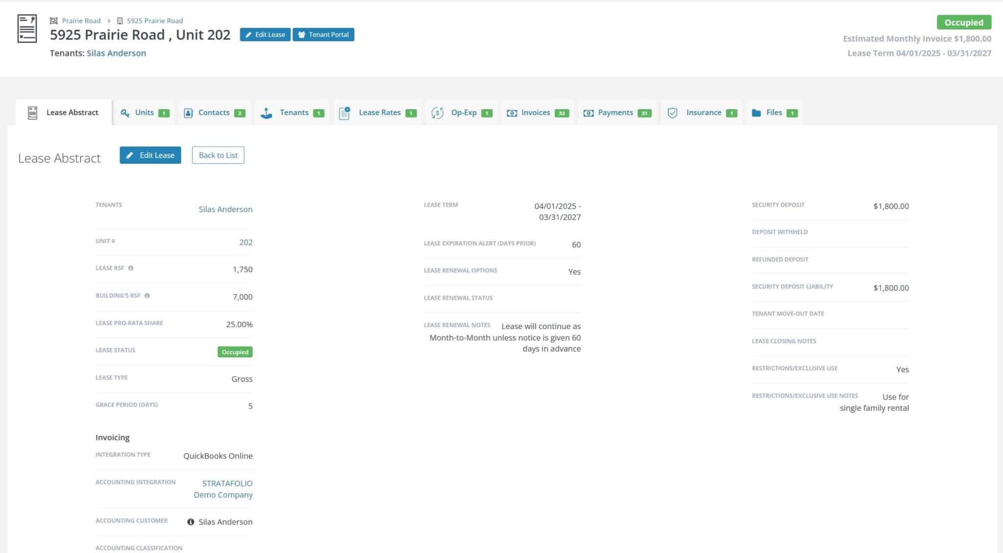 The Lease Abstract provides a complete snapshot of every lease from basic terms to financial integration, helping you stay organized, prevent missed renewals, and maintain accurate accounting.