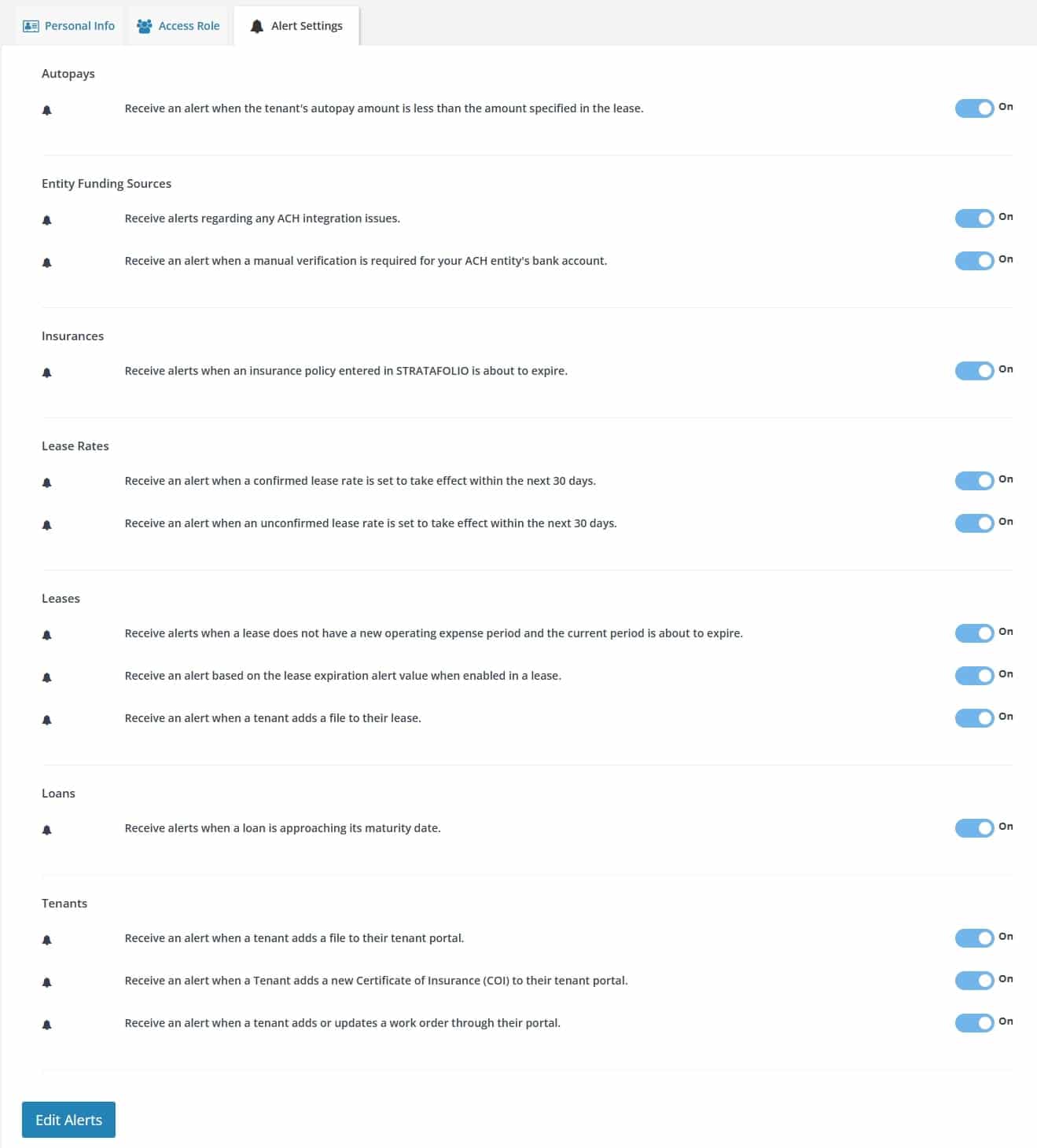 The Alert Settings tab allows you to customize which alerts you receive within the platform.