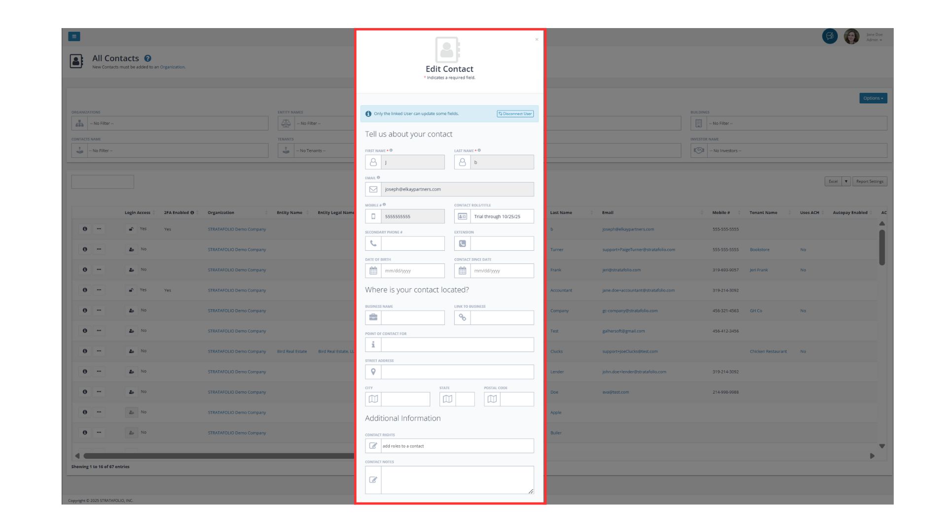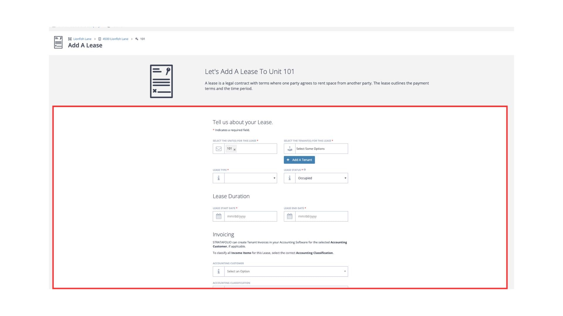 Forms are used throughout the STRATAFOLIO platform to enter, edit, or update information about records such as tenants, leases, assets, contacts, and more. Regardless of how they appear on screen, all data entry interfaces within STRATAFOLIO are referred to as forms.